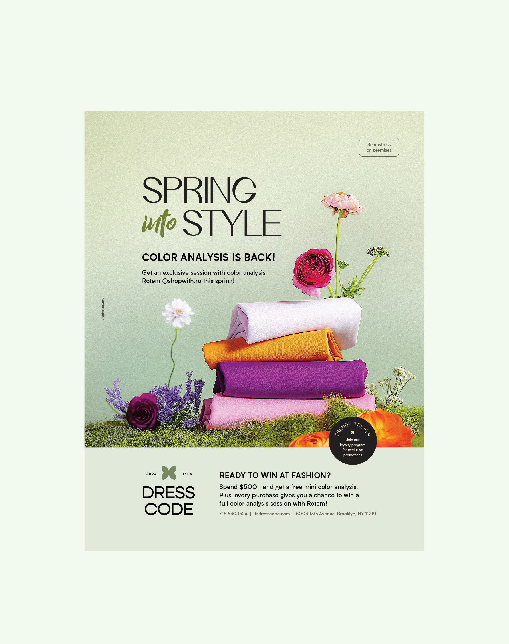 We created a vibrant, summery visual featuring stacked folded fabrics in bold seasonal tones, paired with striking florals to bring energy and beauty to the scene. The concept captures the essence of color analysis while drawing the eye with a cheerful and stylish look — perfect for kicking off the summer in style.